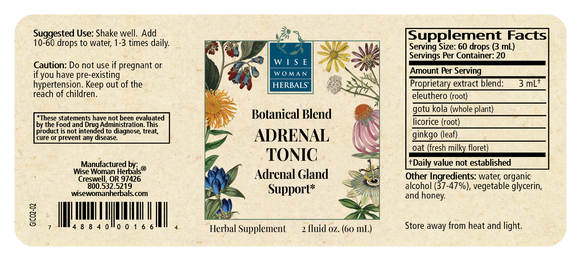 Ingredients: Eleuthero, gotu kola, licorice, ginkgo and oat in a base of organic cane alcohol, mountain spring water, vegetable glycerin, and honey.