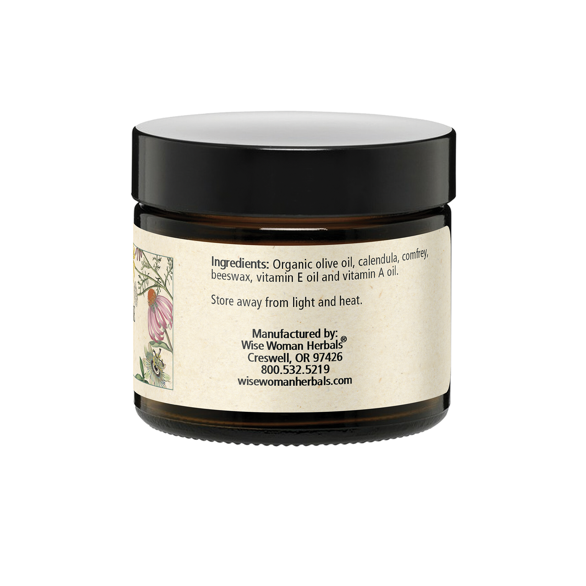 Organic olive oil, calendula, comfrey, beeswax, vitamin E oil and vitamin A oil.