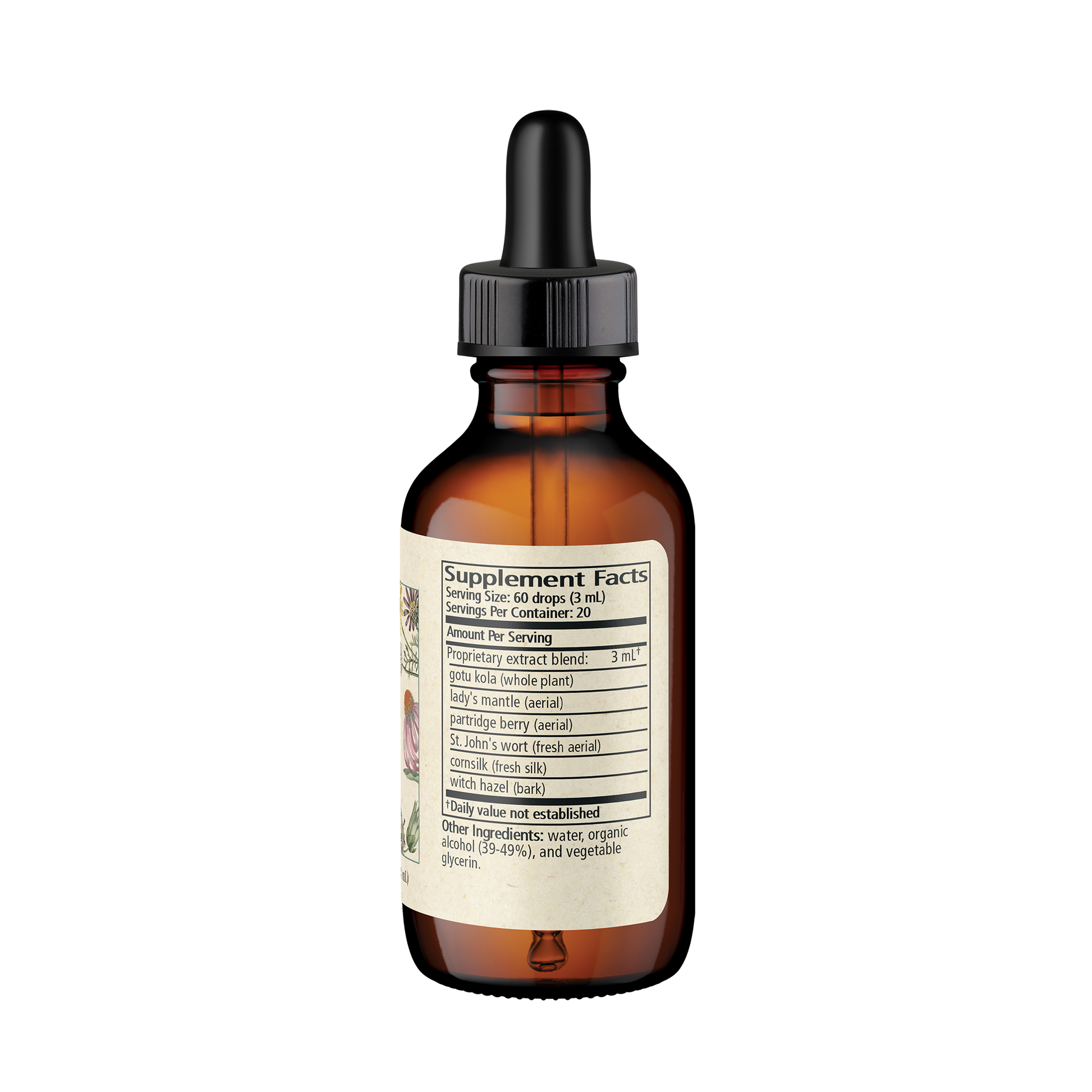Ingredients: Gotu kola, lady's mantle, partridge berry, St. John's wort, corn silk and witch hazel in a base of organic cane alcohol, mountain spring water, and vegetable glycerin.