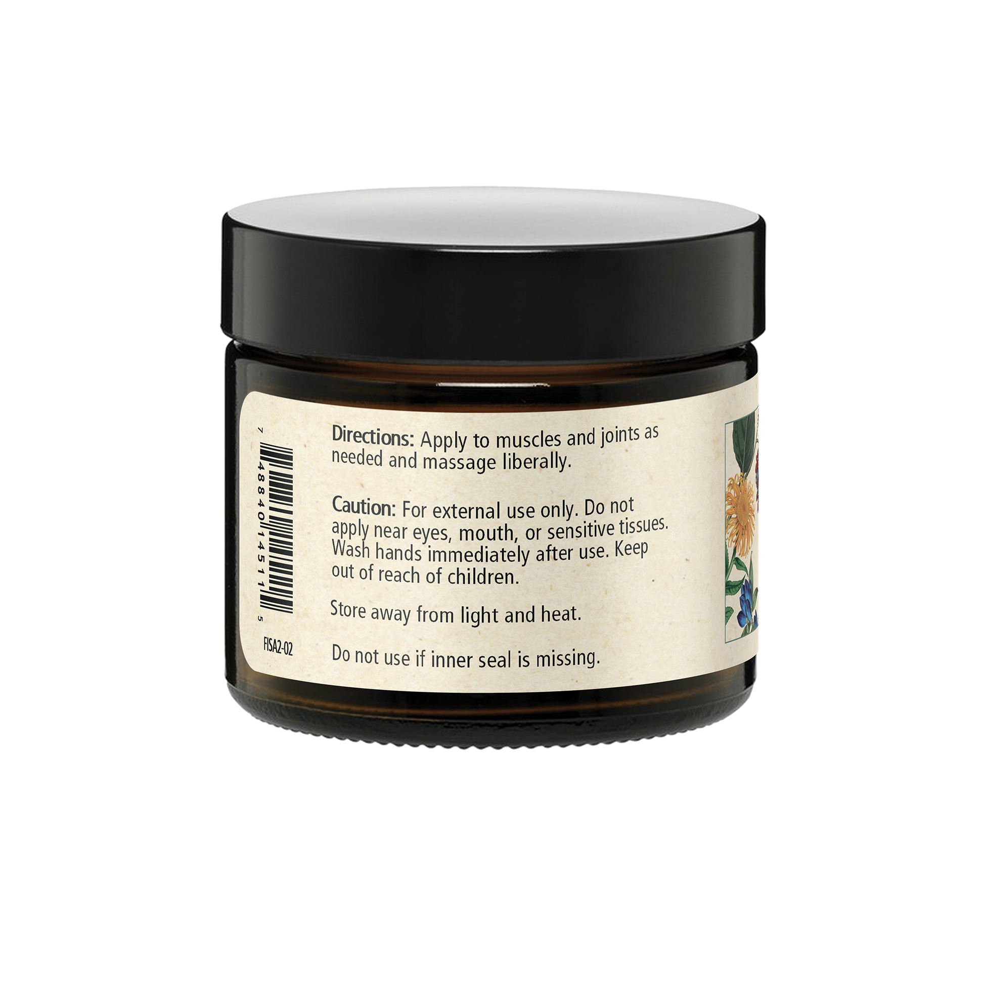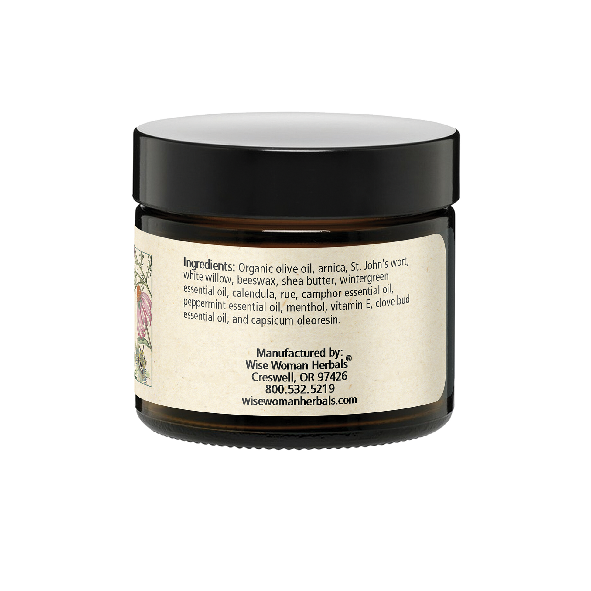 Organic olive oil, arnica, St. John's Wort, white willow, beeswax, shea butter, wintergreen essential oil, calendula, rue, camphor essential oil, peppermint essential oil, menthol, vitamin E, clove bud essential oil and capsicum oleoresin.