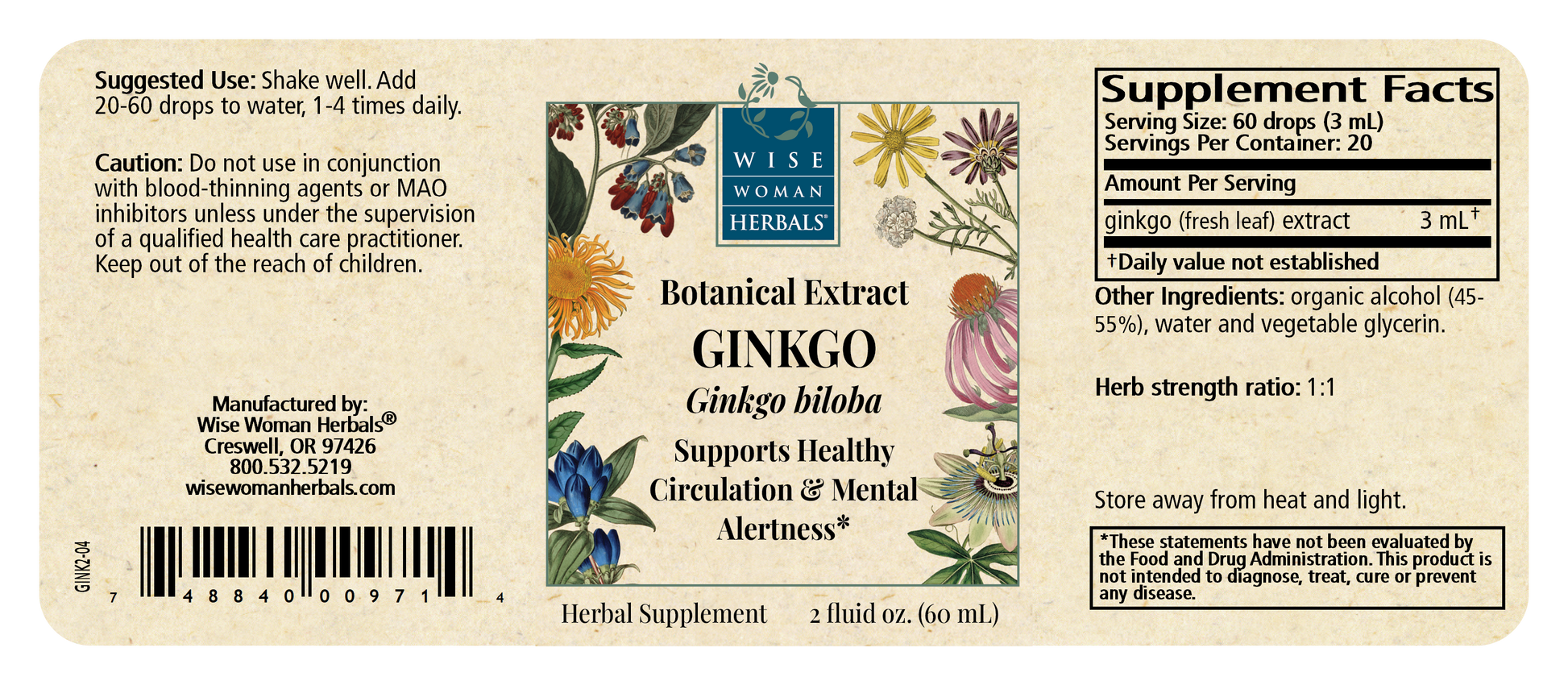 Ingredients: Ginkgo (fresh leaf) extract, in a base of organic cane alcohol, mountain spring water, and vegetable glycerin.