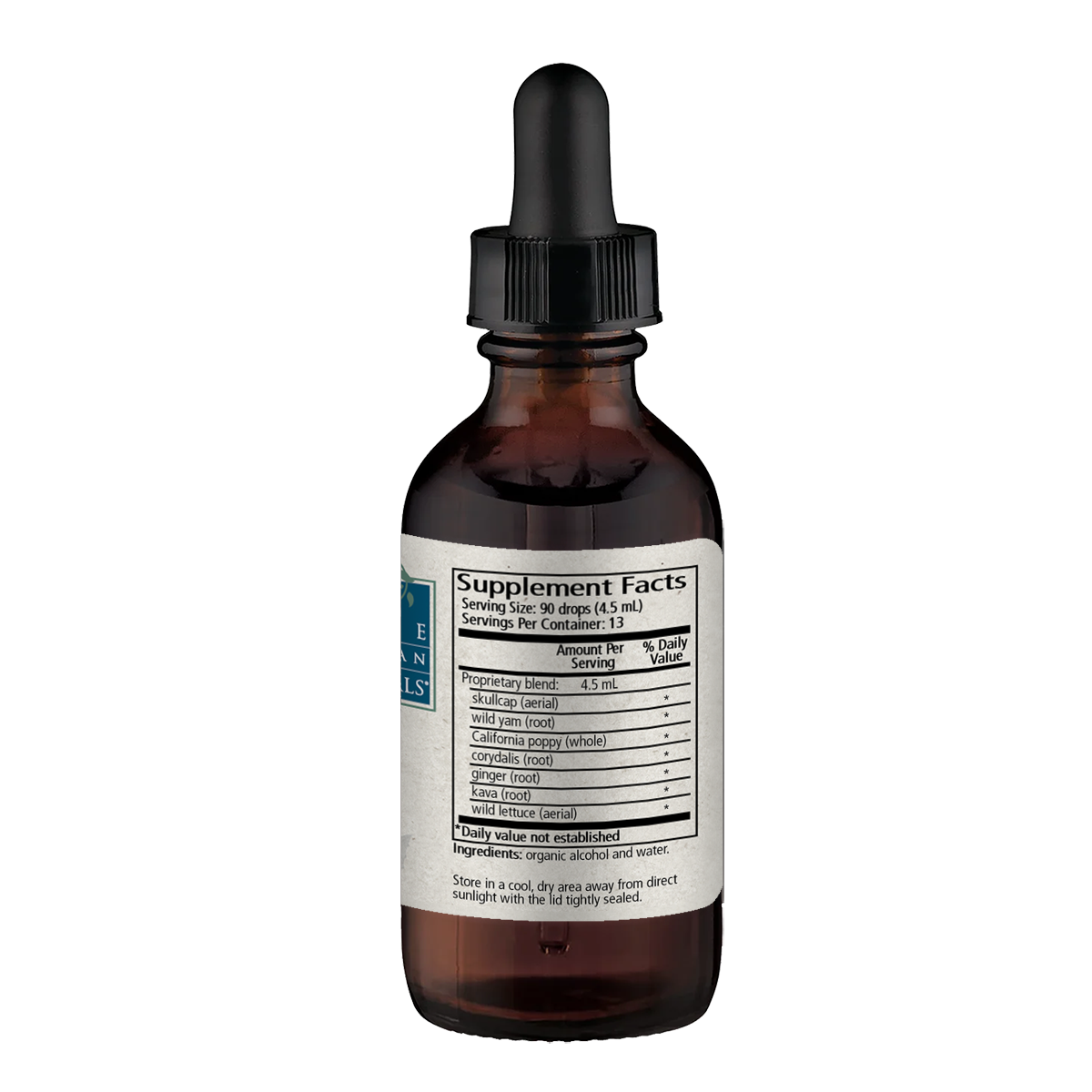 Skullcap (scutellaria lateriflora), wild yam (Dioscorea villosa), California poppy (Eschscholzia californica), corydalis (Corydalis yanhuso), ginger (Zingiber officinalis), kava (Piper methysticum), wild lettuce (Lactuca spp.) in a base of organic cane alcohol, water, and vegetable glycerin.