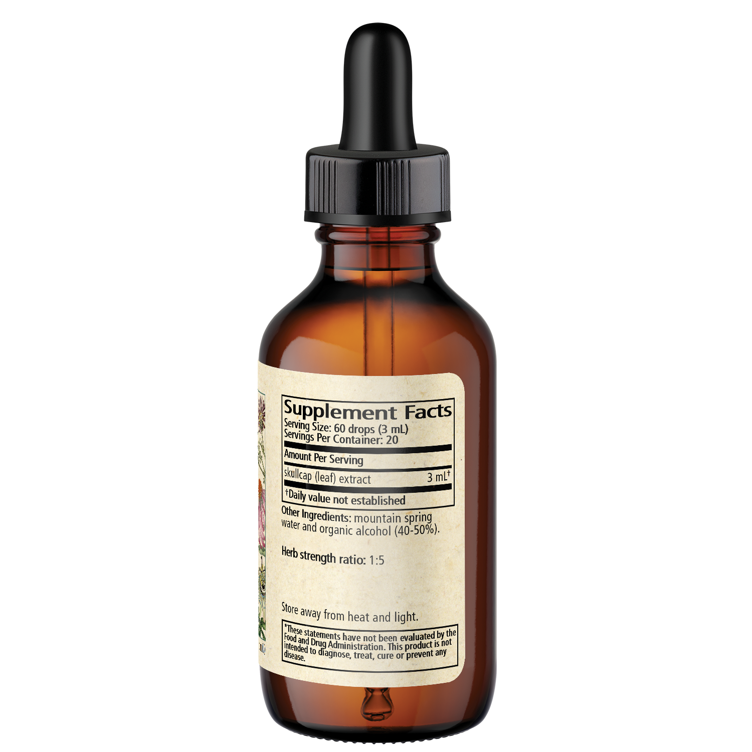 Ingredients: Skullcap (leaf) extract, mountain spring water, organic alcohol (40-50%). Herb strength ratio 1:5