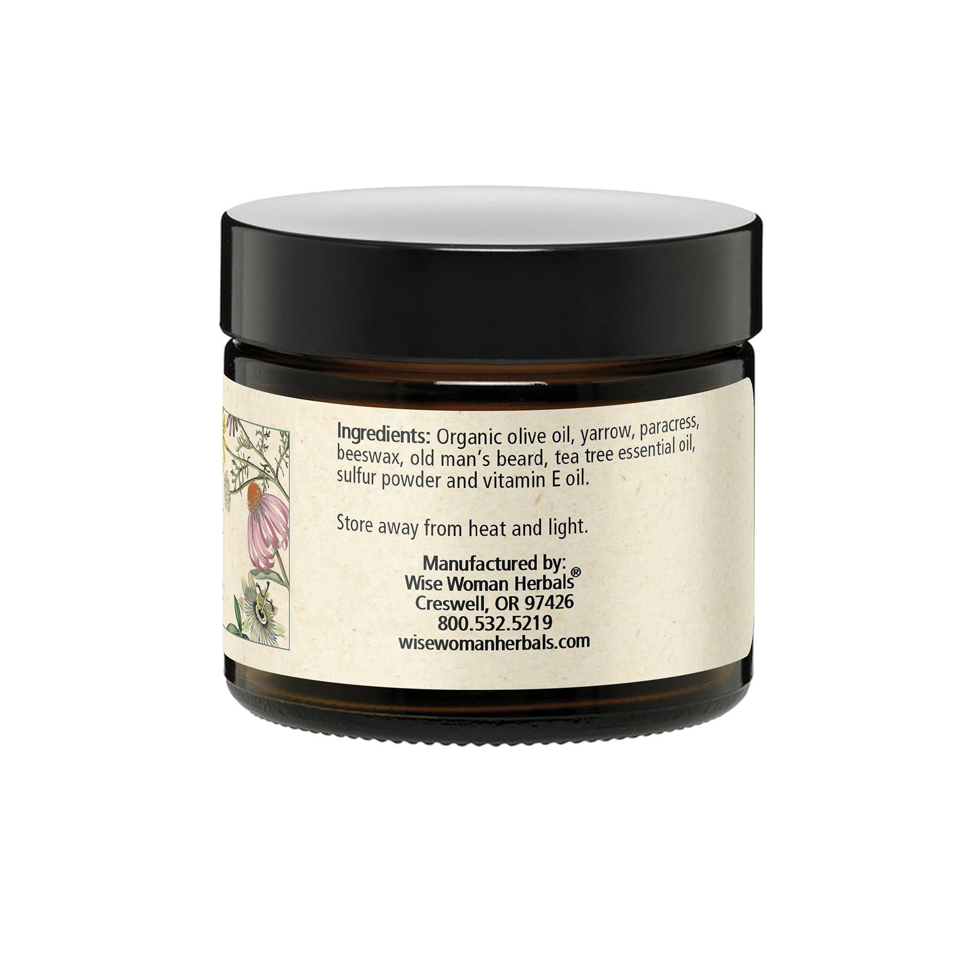 Organic olive oil, yarrow, paracress, beeswax, old man's beard, tea tree essential oil, sulfur powder and vitamin E.