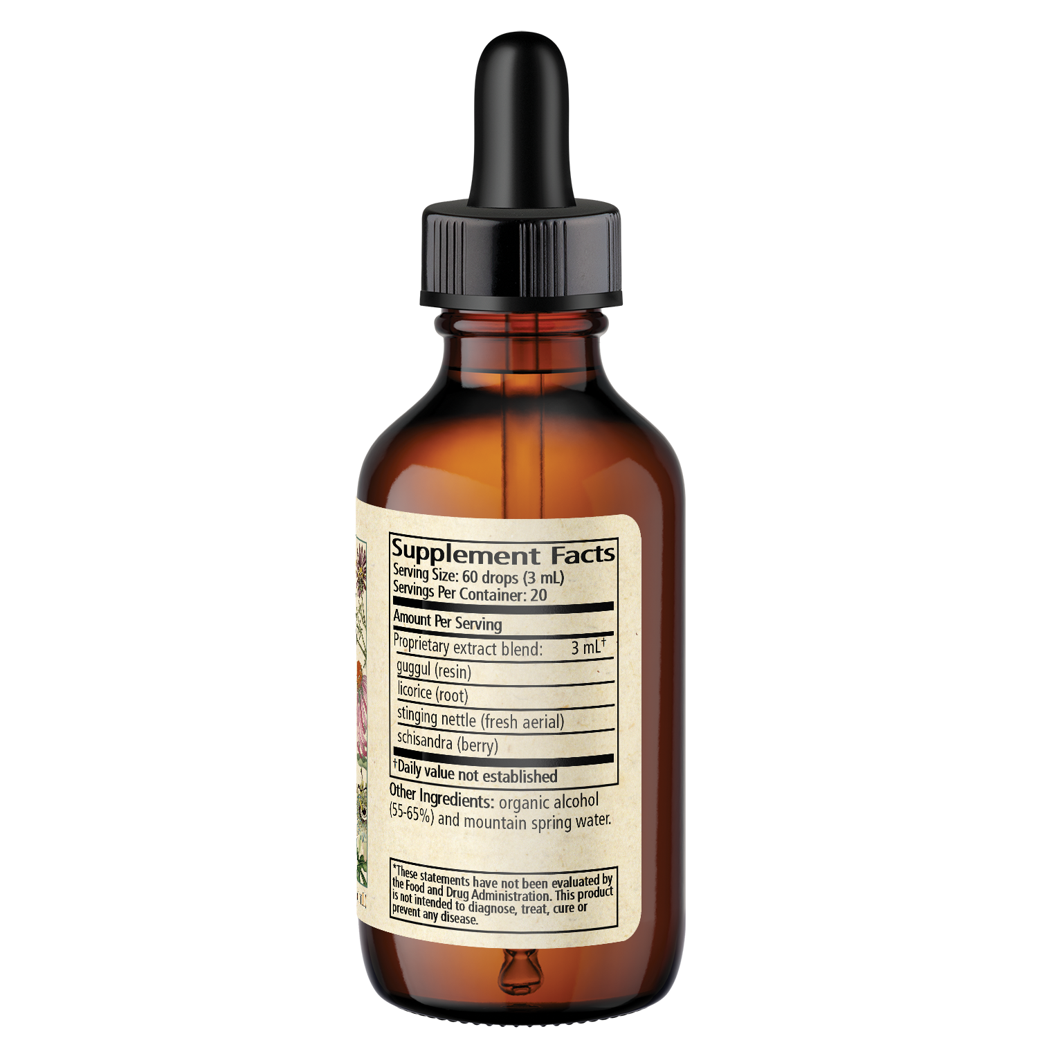 Ingredients: Guggul, licorice, stinging nettle and wu wei zi in a base of organic cane alcohol and mountain spring water.