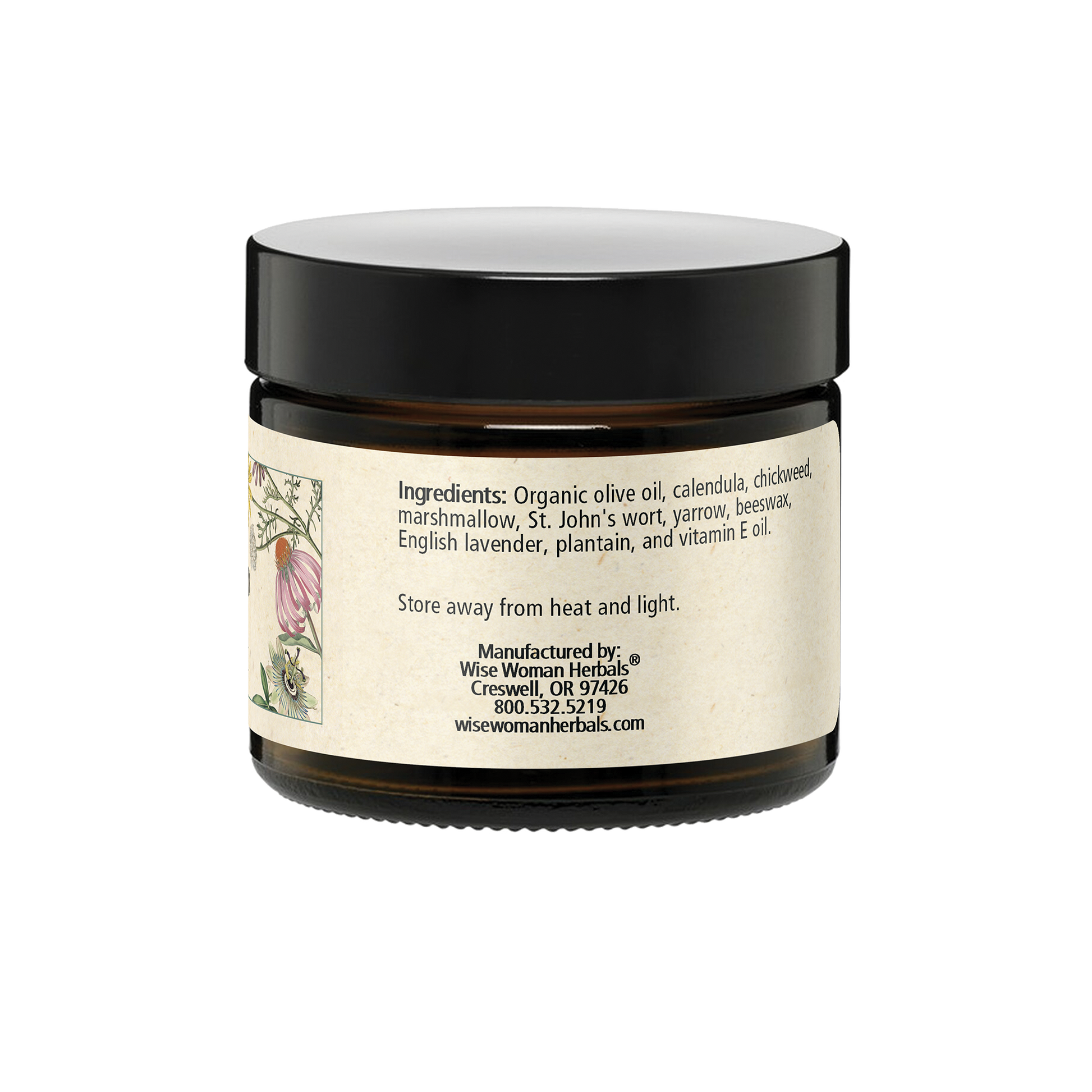 Organic olive oil, calendula, chickweed, lavender, marshmallow, St. John's wort, yarrow, beeswax, English lavender, plantain and vitamin E oil.
